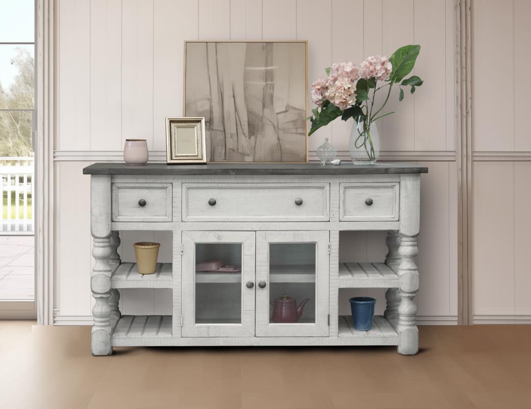 Exuding farmhouse chic with just the right touch of old-world charm, the Stone Collection is meticulously crafted from solid pine wood. The wood is lightly distressed, showcasing a white finish and complemented by weathered gray tops.